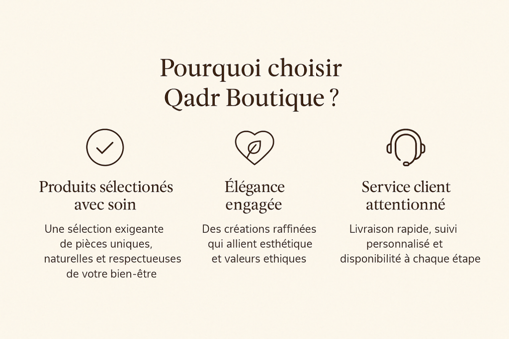 Accueil | Boutique | Notre histoire | Contact Rechercher L’univers Qadr Chez Qadr Boutique, chaque pièce est pensée pour éveiller les sens et apaiser l’esprit. Notre sélection mêle beauté, douceur et intention, pour une expérience authentique, loin du superflu. Bienvenue dans un monde où l’élégance naturelle rencontre le bien-être au quotidien. Ce que disent nos clients Commande reçue rapidement, très satisfaite de la qualité du jilbeb. Je recommande les yeux fermés ! Imane Magnifique parfum solide, la senteur tient longtemps et la présentation est trop jolie. Sahra Site très professionnel, j’ai adoré l’attention aux détails dans l’emballage. Merci Qadr Boutique ! Leila